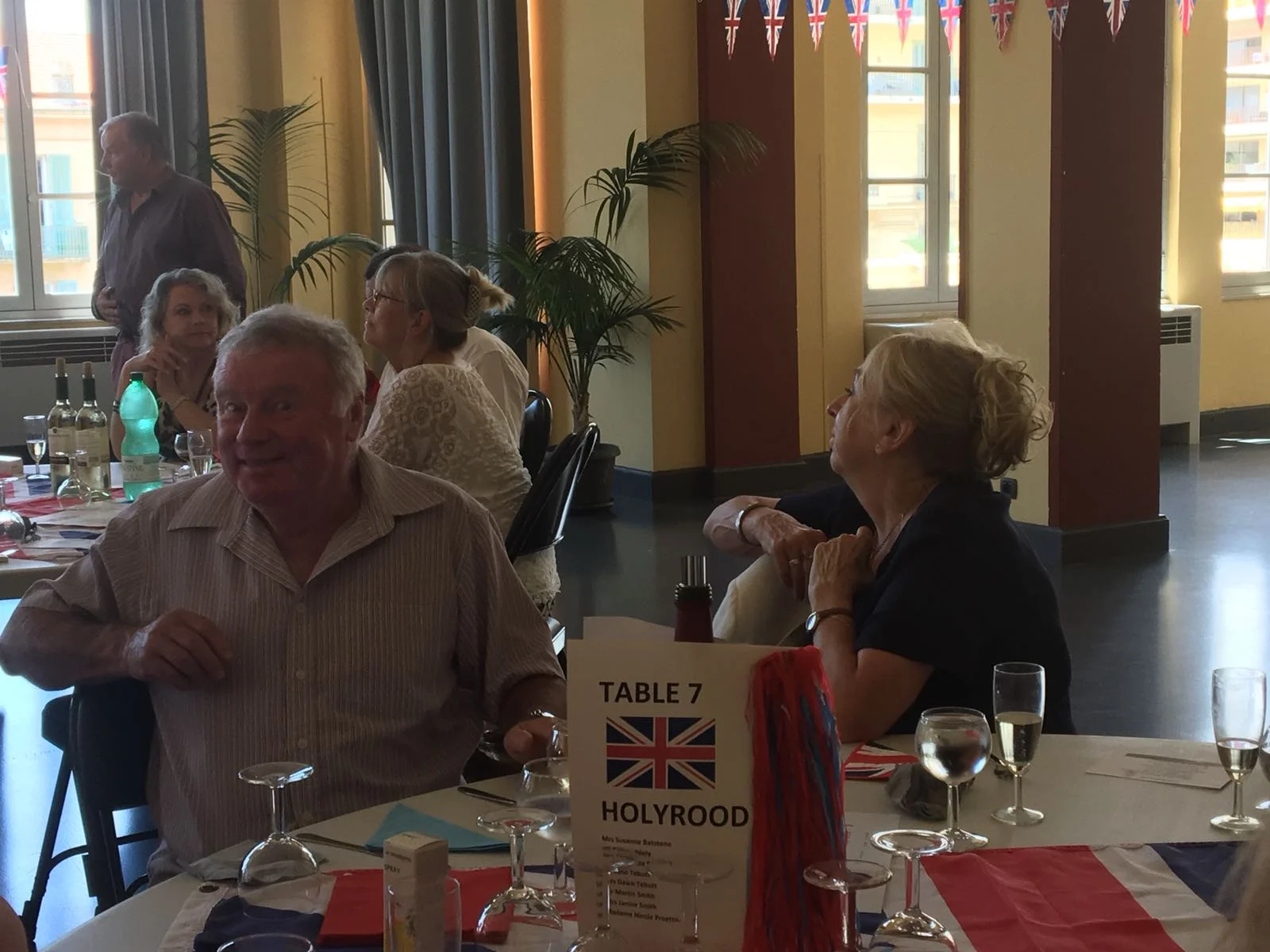 My thanks to Annie and Judy for the pretty floral decorations, to the volunteers who decorated the Salle de Grand Bretagne the afternoon before, To Helene for collecting last minute payments and raffle total, to Jessica, Charlie and Helene for selling raffle tickets and to our very own “Ant & Dec” in charge of the raffle, (Also known as Pete & Dave.)